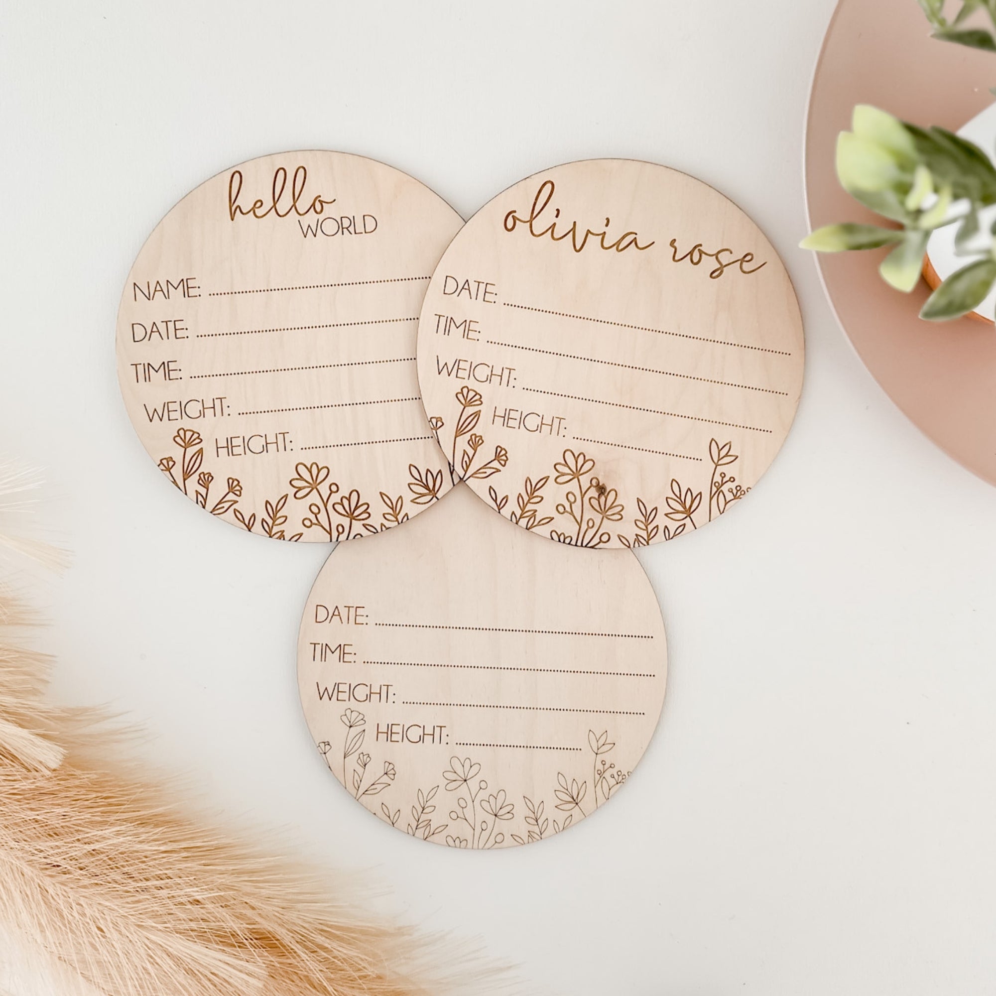 Minimal Floral Birth Stat Disc – this one leaves space for you to write in your babies name, simple and elegant for recording birth details.