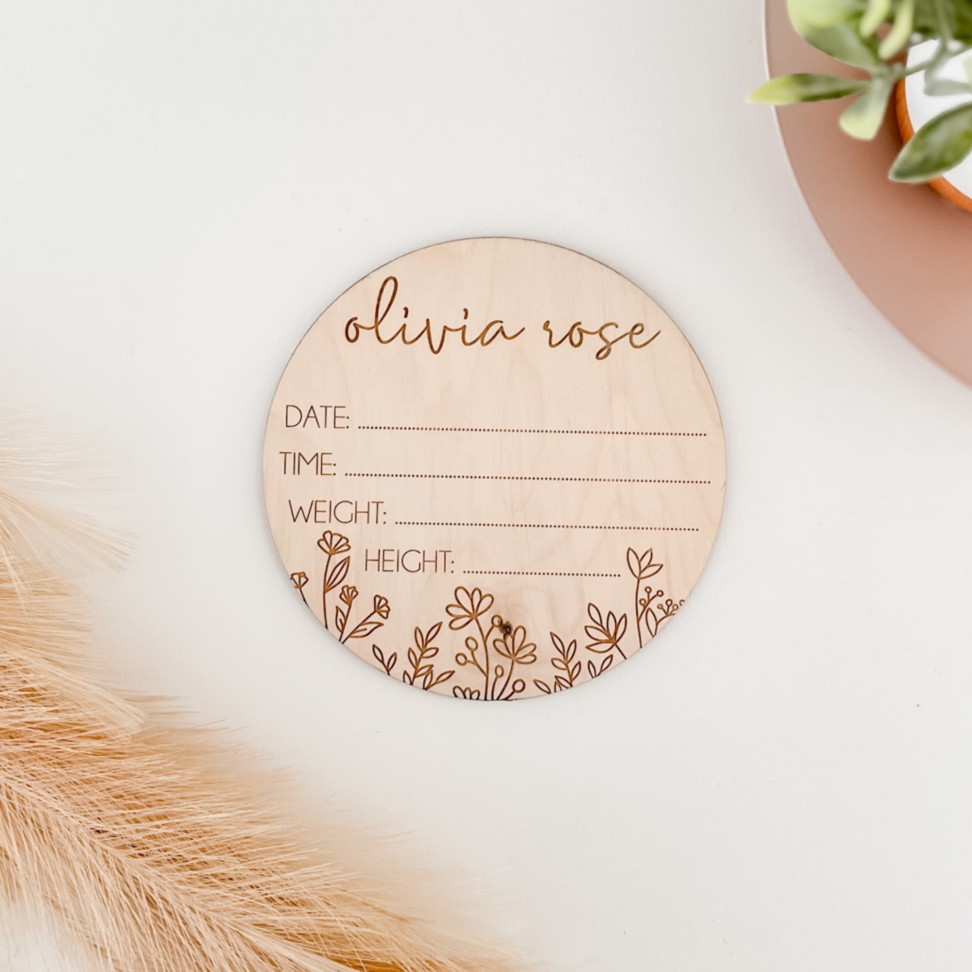 Celebrate your little one’s arrival with these beautifully engraved wooden birth announcement discs. Each disc is made from high-quality natural wood, measuring 4 inches wide, and features delicate floral designs with customizable details for your baby’s name, date, time, weight, and height.